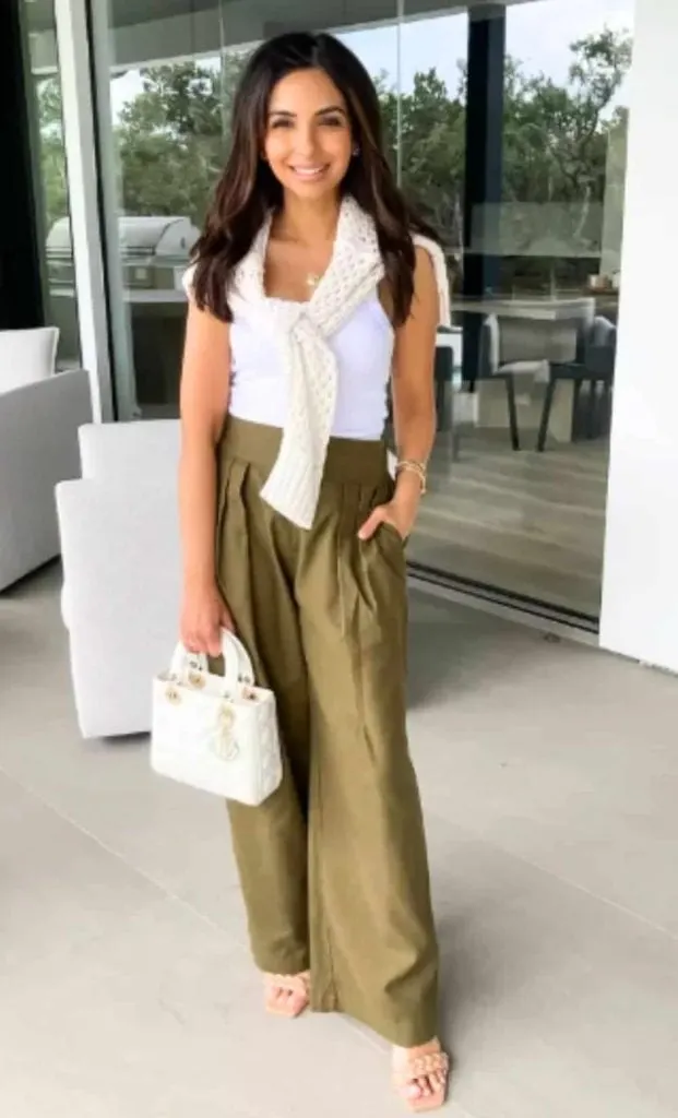 Style the high-waist olive green linen pants with a white crop top and strappy sandals; it just alludes to a cool, effortless sense of style in the summer days.